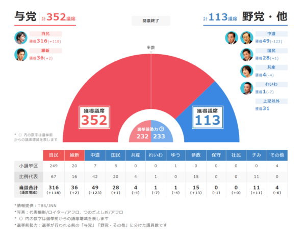 自民と維新の与党で3/4の議席を獲得、自民党単体で2/3の議席を獲得という結果になりました。